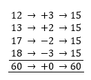 This means if all four numbers were replaced by 15, the sum would remain 60. But note the actual distribution: two numbers (12, 13) are below the average, two numbers (17, 18) are above. The spread is relatively small.